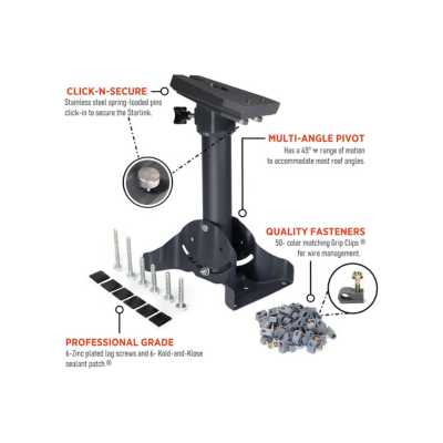 Made with 2mm Heavy Duty Steel and a durable space gray powder-coated finish, the Starlink Standard Generation 3 Heavy Duty Pivot Roof Mount Kit from Satellite Oasis is designed to withstand severe weather and high wind loads. Simply attach the mount to the roof surface and just "click" the dish into the mount, point the dish, and it's ready to use.